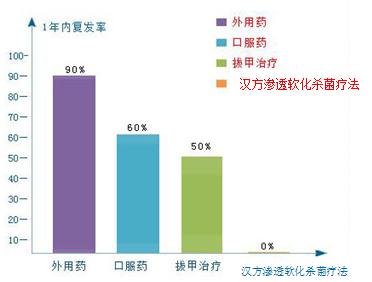 “汉方渗透软化杀菌疗法”通过科学诊断系统迅速检验出真菌类型,以生物化学、分子生物学及生物提取技术,首先将北大医院专研的特色中药渗透入病甲真皮下,通过软化病甲、坏甲,快速消除浅层病菌;仪器分解指定特效药物将药物离子渗透到甲床下部,穿透病甲,杀死深层病菌;高效药物结合生物激活分子缓释技术直接渗透甲根部,修复受损甲床,促进甲床新生、杀菌、保养为一体,快速治疗防复发。
