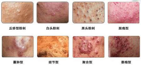 7、粉刺性青春痘:初发者有白头和黑头粉刺两种。白头粉刺又称闭合性粉刺,为皮色丘疹,开口不明显,不易挤出脂栓;黑头粉刺又称开放性粉刺,位于毛囊口的顶端,可挤出,叫硬脂栓。